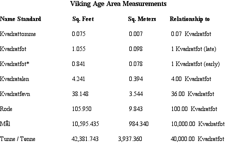 Listed here are some very old measurements from Norway. Some are not really from the Viking age, but do come close in the time of usage. I have listed both Sq Feet and Sq Meters here to help those that are not familiar with one or the other system of measurement. Also, Kvadrafot is the base measurement of the old system in Norway, so I have based a Relationship Standard segment to this measurement as a gauge. As in the Length Measurement chart I used the length of a Fot as 1.030 of a US foot. If you wish to use the older Viking Fot of 11 inches (.917 US Feet) you can use the Relationship to Standard figures to convert the other measurements to the older system.
